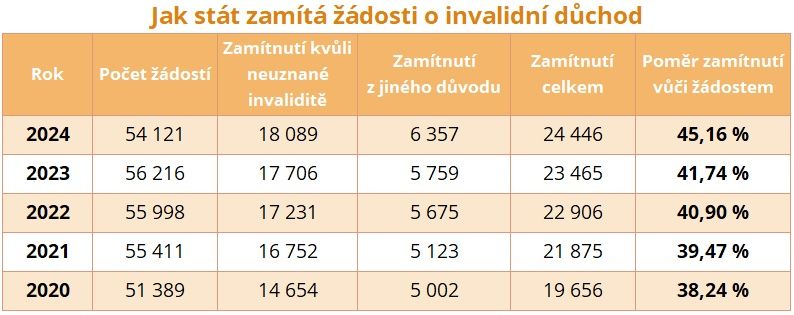 Zatímco počet žádostí o invalidní důchod se nijak zásadně nemění, počet zamítnutí kontinuálně roste. Patrné je to zejména z poměru mezi žádostmi a zamítnutími, který v roce 2024 dosáhl už na úroveň 45 %. To znamená, že prakticky každá druhá žádost o invalidní důchod je zamítnuta, a nejčastěji kvůli neuznání invalidity.