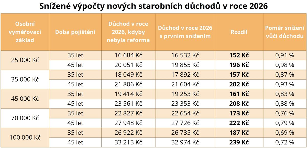 Například u nového důchodce, který měl podprůměrné výdělky a zároveň dlouhou dobu pojištění (25 000 Kč a 45 let), bude snížení 196 Kč, tedy 0,98 % z původního výpočtu důchodu před reformou. A naopak člověk s vysokými výdělky a kratší dobou pojištění (100 000 Kč a 35 let) pocítí snížení 187 Kč, tedy 0,69 % vůči původnímu nesníženému důchodu. Takže rozdíly jsou tady evidentní, osobně je však nepovažuji za tolik významné.