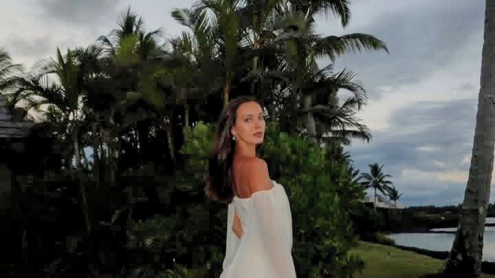 Bílé šaty, tropická zeleň kolem a večerní atmosféra, která působí až filmově. Žádné velké prohlášení, žádná slova.