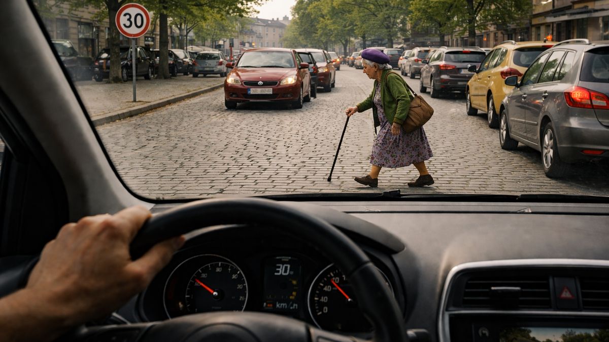 A teď pozor – tady je důležitá věc. Já chápu, že je stará a může mít pohybové potíže. Chápu, že kolena už neslouží, kyčle bolí a rovnováha není, co bývala. Opravdu to chápu. Ale právě proto bych čekal jednu drobnou věc: snahu tu situaci ostatním zbytečně nekomplikovat. Když vím, že jdu pomalu, že auta musejí stát, že zdržuji provoz, tak přece zvolím nejkratší možnou cestu. Kolmo přes silnici. Rychleji to nepůjde – tak ať to alespoň netrvá déle, než je nutné.