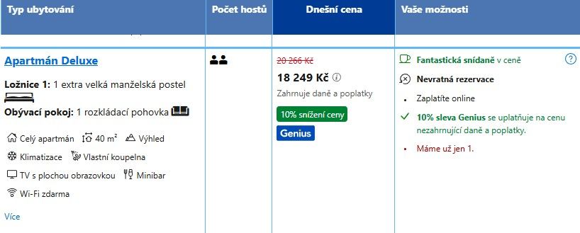 V ten moment se člověk neubrání dojmu, že nesleduje ceník ubytování, ale živou ukázku toho, kam až lze posunout pojem „poptávka“. Rozdíl mezi pracovním dnem a víkendem činí téměř čtyřnásobek. Jinými slovy: stejný pokoj je o víkendu skoro čtyřikrát dražší než v týdnu, aniž by se změnilo cokoliv jiného než datum v kalendáři. Co se tedy o víkendu stane? Přibude personál v bílých rukavičkách? Změní se kvalita matrace? Otevře se tajná wellness zóna dostupná jen od pátku do neděle? Nic takového. Jedinou skutečnou změnou je to, že lidé mají volno a chtějí přijet. A to, jak se ukazuje, bohatě stačí.