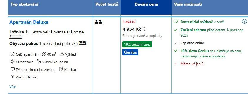 V pracovní dny ta realita vypadá relativně snesitelně. Cena po uplatnění věrnostní „slevy“ — no tak, všichni víme, jak to s těmi slevami bývá — činí 4 954 Kč za noc, včetně daní a poplatků. Zrušení zdarma, žádné háčky, žádná povinnost prodat orgány předem. Není to málo, ale v kontextu prosincové Prahy si člověk řekne, že to pořád spadá do kategorie „bolí to, ale dá se s tím žít“.