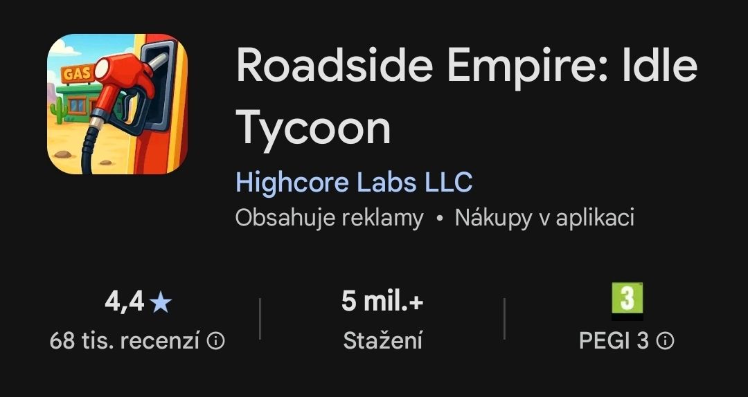 Když se člověk občas nudí a má po ruce jen mobil, sáhne po nějaké té „neškodné“ hře z Google Play. Řekl jsem si tedy: proč nevyzkoušet něco, co zní docela nevinně? Roadside Empire – název jako vystřižený z dětské učebnice angličtiny, hodnocení PEGI 3, takže oficiálně vhodné i pro batolata, a obrázky lákající na budování vlastního impéria benzínových pump a fast foodů. Kdo by odolal? Řekl jsem si, že když mě to nebude bavit, alespoň zjistím, co dnes vlastně děti klikají. Jenže už po několika minutách hraní se mi dostalo zážitku, který bych od hry s ratingem PEGI 3 opravdu nečekal.