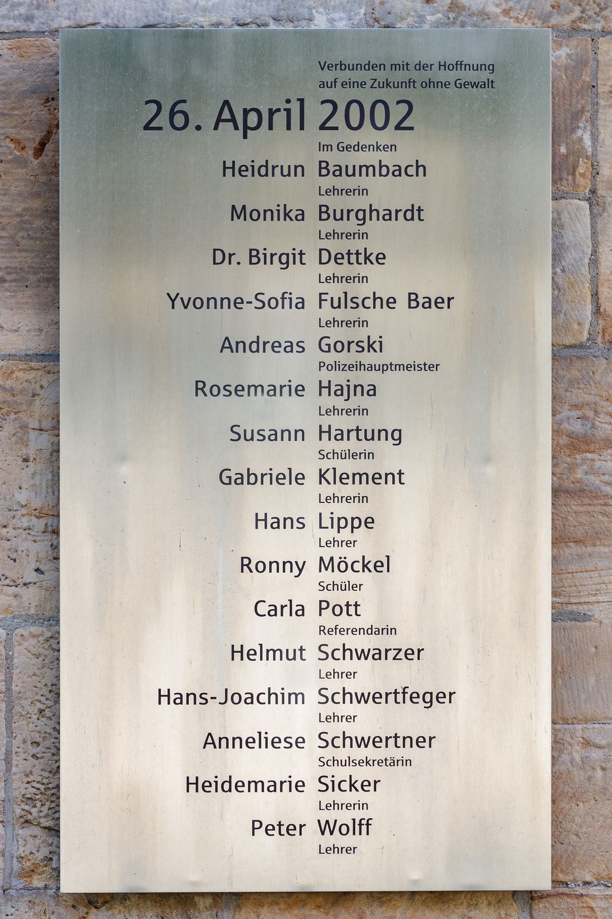 Je dvacátý šestý duben roku 2002. Na Gutenbergově střední škole v Erfurtu plyne den, jako každý jiný. Probíhá výuka, maturitní ročníky skládají své zkoušky a nic nenasvědčuje tomu, že právě přišel den, který se zapíše do historie jako jeden z největších masakrů na školách v Německu a bude mít takový dopad na společnost, že povede ke změnám celých zákonů.