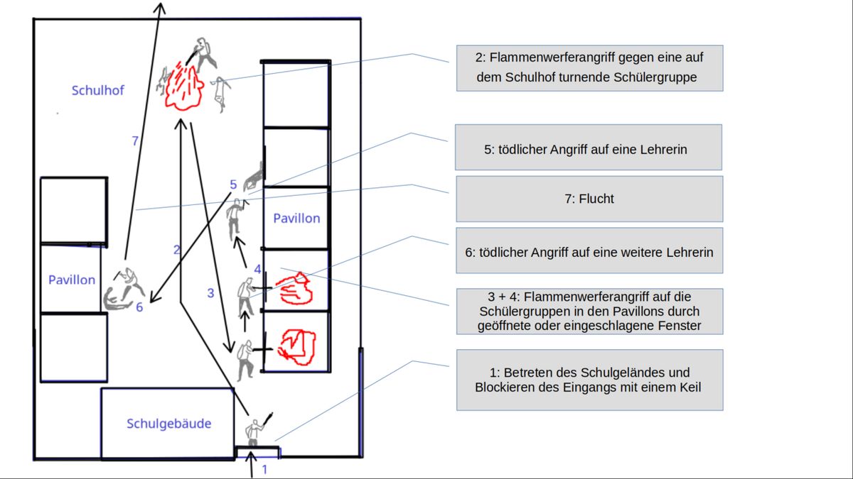 Seifert vstoupil na školní pozemek krátce před velkou přestávkou. Na zádech nesl plamenomet, v rukou kopí, prak a dřevěný klín. Posledním nástrojem za sebou zablokoval malou branku, aby nikdo nemohl utéct. Rozhlédl se. Na druhém konci školního dvora probíhala hodina tělocviku pod vedením učitelky Langhornové. Vydal se za nimi. Příchod cizího muže s kopím v ruce a divným nástrojem na zádech nevěstil nic dobrého. Učitelka se instinktivně postavila před děti. Seifert nemeškal. Namířil na ni ze šesti metrů a spustil svůj ďábelský vynález. Mohutný plamen vyšlehl a olízl siluetu statečné učitelky. Její oděv okamžitě vzplál. V šoku a bolestech se skácela k zemi a snažila se uhasit hořící látku. Přihlížející děti zůstaly stát jako přikované. Do chvíle, než na ně agresor zamířil a vypustil plamen znova. Byl to masakr. Některé z dětí zoufale křičely bolestí. Oheň jim sžíral kůži. Ty, co mohly, se daly na útěk. Seifert je nepronásledoval.