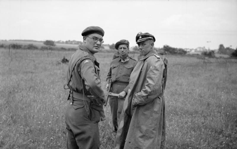 Důstojník SS mezi prvními vězni zajatými 8. sborem kolem Cheux během bitvy o Francii, 26. červen 1944