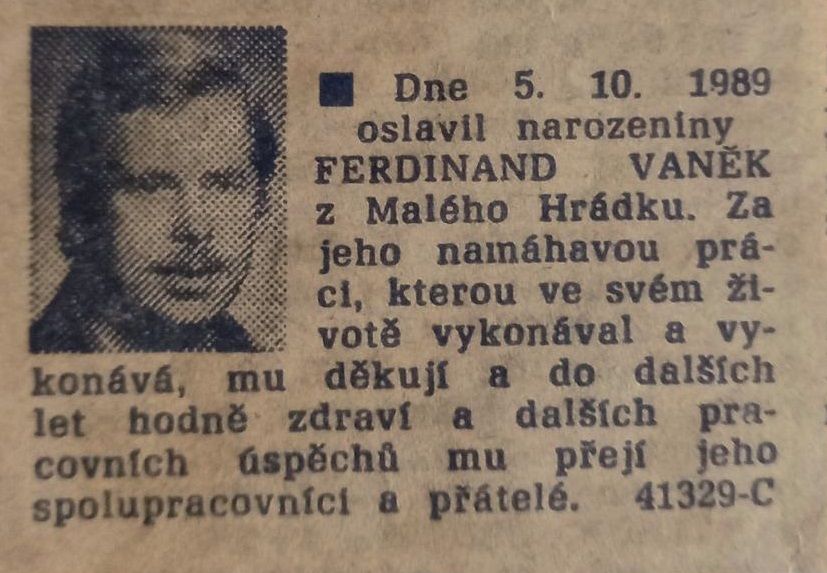 „Dne 5. 10. 1989 oslavil 53. narozeniny Ferdinand Vaněk z Malého Hrádku. Za jeho namáhavou práci, kterou ve svém životě vykonával a vykonává, mu děkují a do dalších let hodně zdraví a pracovních úspěchů mu přejí jeho spolupracovníci a přátelé.“