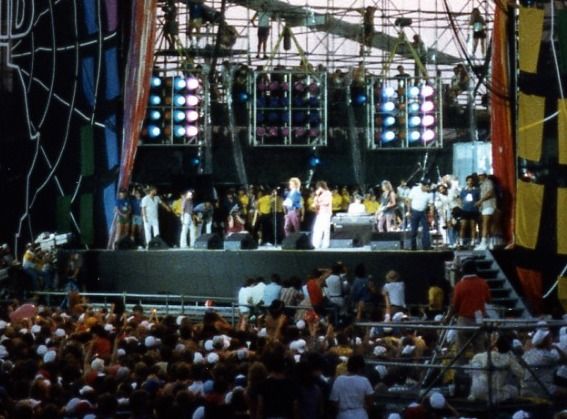 A pak to vypukne. Program ve Wembley zahajují rockeři Status Quo, kteří stadion rozezpívají hitem Rockin’ All Over the World. Symbolická volba – „rozezpívat celý svět“ se ten den skutečně podaří. Osmihodinový maraton v Londýně střídá po časovém mostě šestihodinová show v Americe.