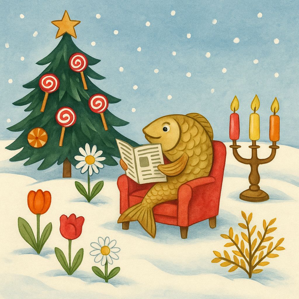 Na obrázku je několik nesmyslů. Dokážeš je všechny najít? A o čem si ten kapr asi tak čte?
