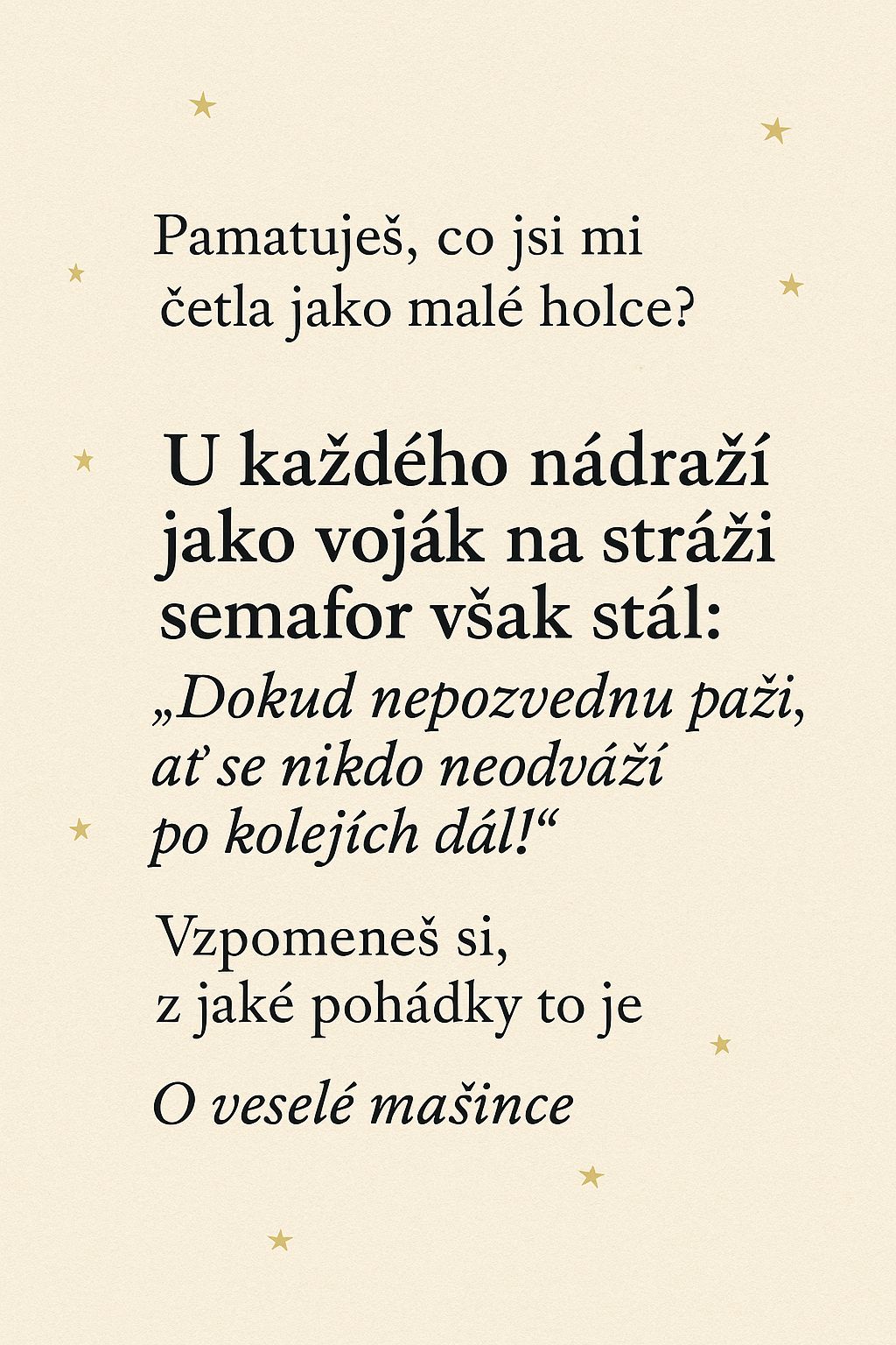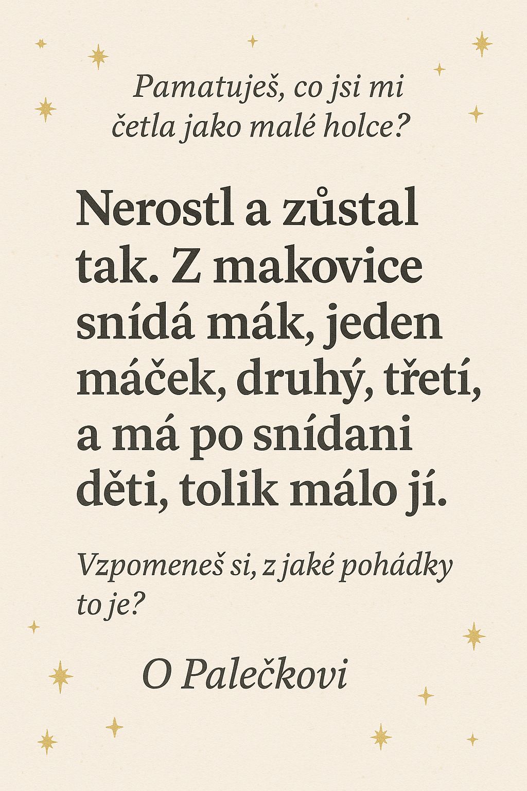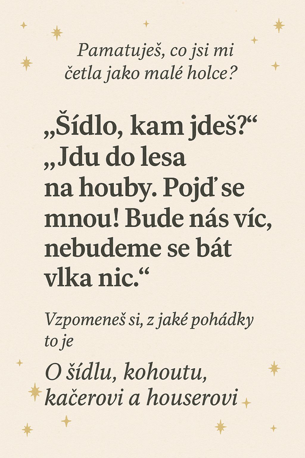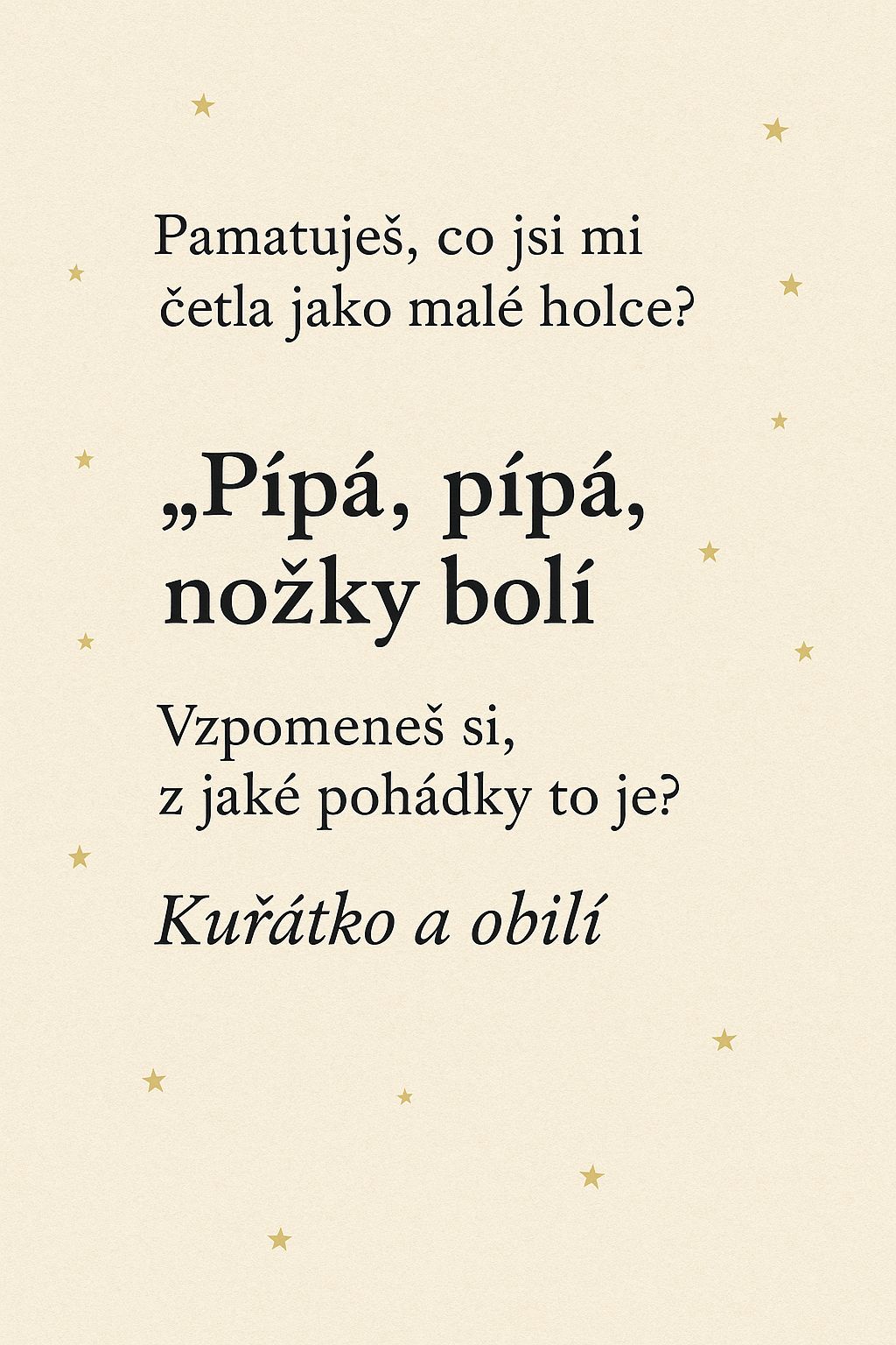 Na pátou obálku jsem šla naopak s nostalgií. Vzpomněla jsem si totiž, jak jsem u ní jako malá holka spávala a ona mi četla pohádky. Pohádky, které si do teď pamatuji a dokáži z nich citovat úryvky. Paradoxně až na tu mou nejoblíbenější, ale zase si z ní pamatuji obrázek. A tak jsem si říkala, že když jsem si vzpomněla na knížky z doby, kdy jsem ještě ani nechodila do školy, mohla by si na ně vzpomenout i babička. A vrátit se tak se mnou na chvíli do let… do let, kdy měla slunečnicové povlečení a budila mě přípravou snídaně, ke které musel být obligátně rohlík a čaj. Jediný čaj, který jsem v těchto letech dokázala pozřít a ještě si na něm dokonce pochutnat.