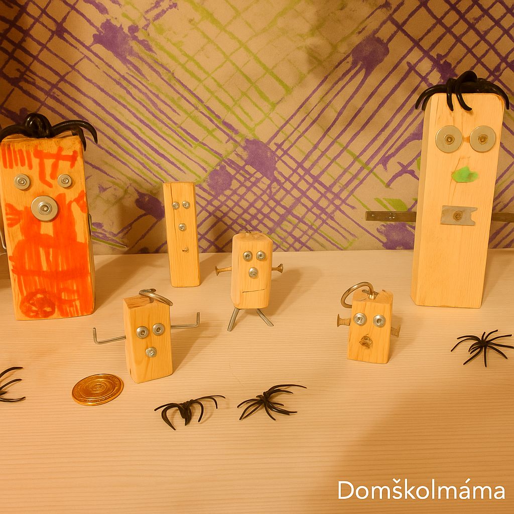 Děti milují tvoření ze dřeva. Ve sklepě si postupně zařizují svou dílničku a ateliér. Takovou rodinku strašidel vyrobila pod tatínkovým dohledem naše pětiletá dcera.