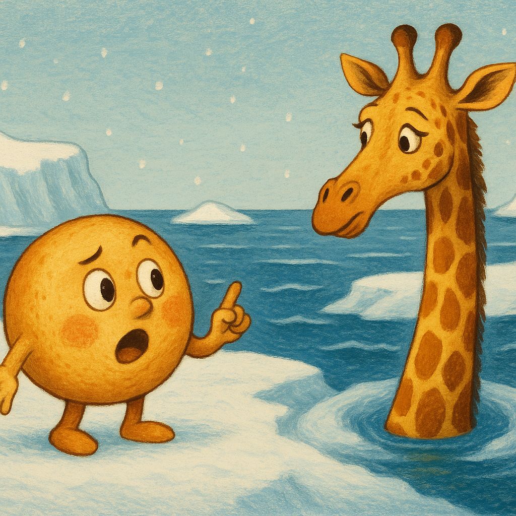 Koblížek pokračoval dál a dál… až došel na severní pól. A koho tam potkal? Žirafu. Protože proč ne. „Ty mě určitě nechceš sníst, viď?“ Žirafa si chladila krk v moři ledu a mávla tlapkou: „Prosím tě, já tu jen regeneruju. Dlouhý krk se přehřívá.“
