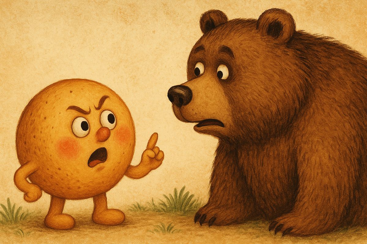 Za chvíli potkal Koblížek Medvěda. „Chceš mě sníst?“ - předešel ho Koblížek.