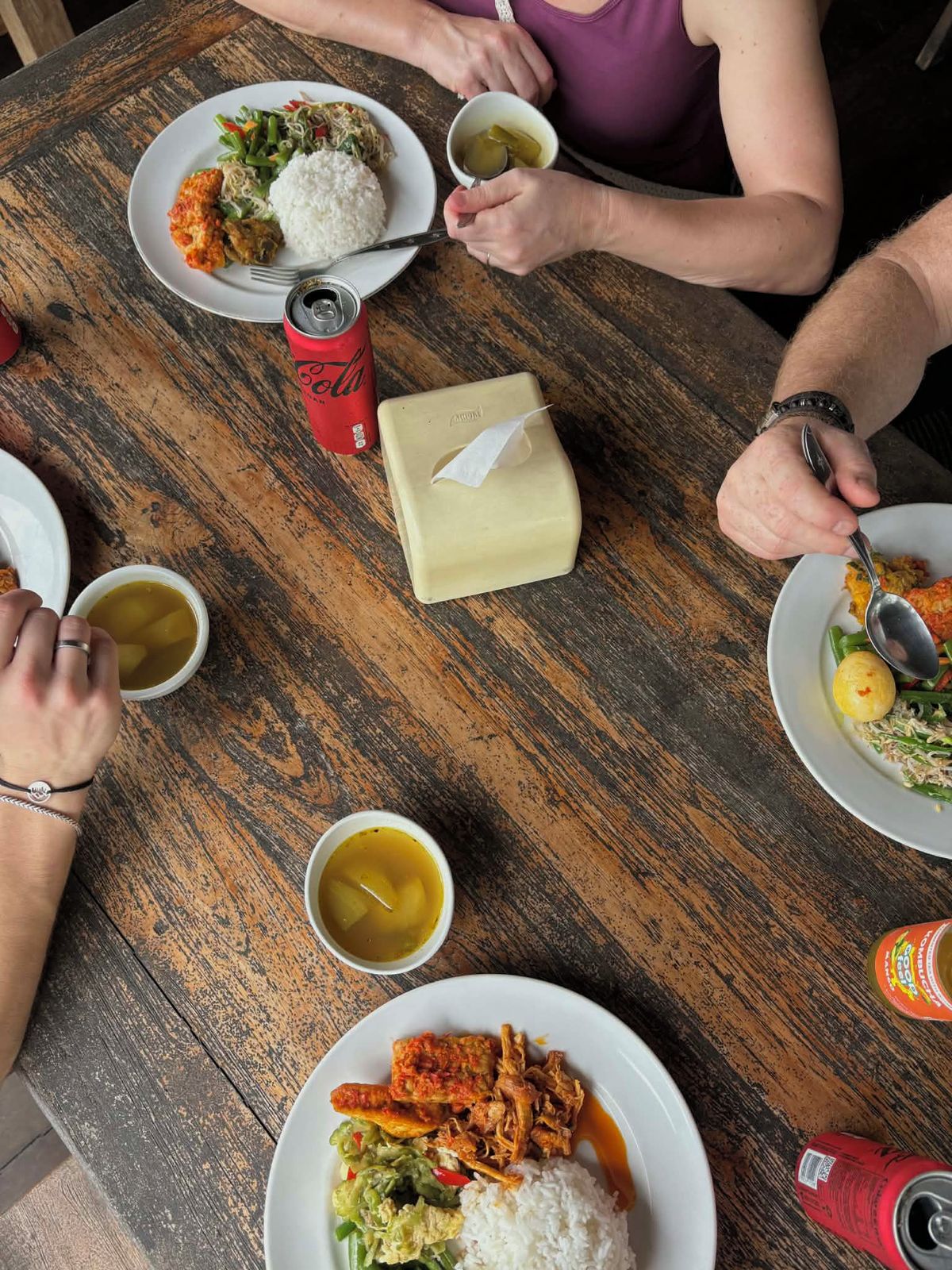 Vařit si na Bali se příliš nevyplatí. Nabídka v obchodech je omezená, zatímco místní kuchyně je pestrá, chutná a levná. Základem je rýže ve všech podobách, zejména smaženou rýži Nasi Goreng potkáte na každém rohu. Pro milovníky masa se přímo nabízí vyzkoušet místní specialitu Babi Guling, tedy sele pečené na rožni nebo masové špízy saté. Chybu neuděláte ani objednávkou jejich výborné kořeněné polévky Soto Ayam. Autentickou chuť Bali nabízí zejména místní bistra, takzvané warungy. Doporučit můžu konkrétně například Adi Warung nebo Kayana Ubud warung, kde si ke kopečku rýže vybíráte malé porce různých druhů příloh přímo z vitríny za sklem.