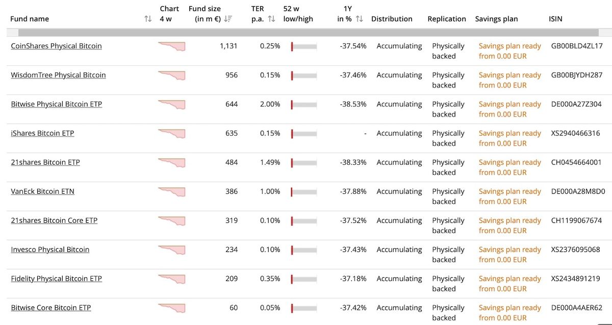 Takových ETP s Bitcoinem je docela dost, na webu justetf.com jich najdeš rovnou 19, tady jsou první dle velikosti. Sloupeček TER ti říká, jak moc je daný cenný papír drahý. Čím vyšší číslo, tím dražší a tím nižší budeš mít výnos. Vyber si něco kolem 0,15 % a vyhni se hodnotám nad 1 %.