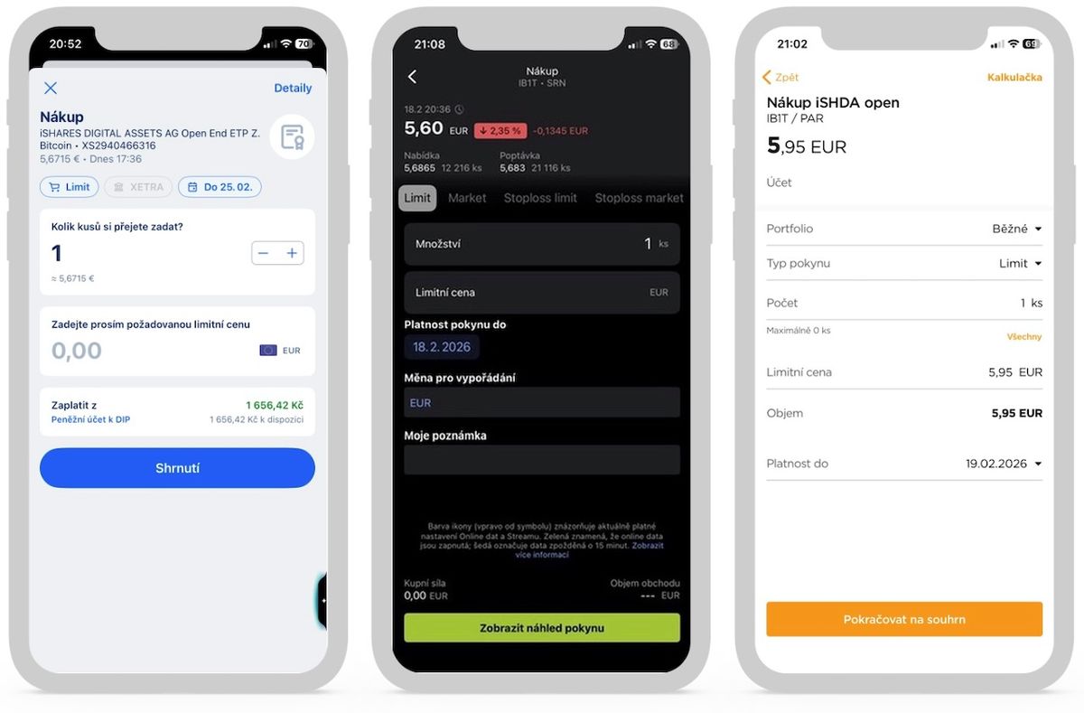 Ukázka nákupu vybraného ETP u třech různých obchodníků. Zleva Česká spořitelna, Fio banka a Patria Finance. Zdroj: mobilní aplikace uvedených společností k 18. 2. 2026