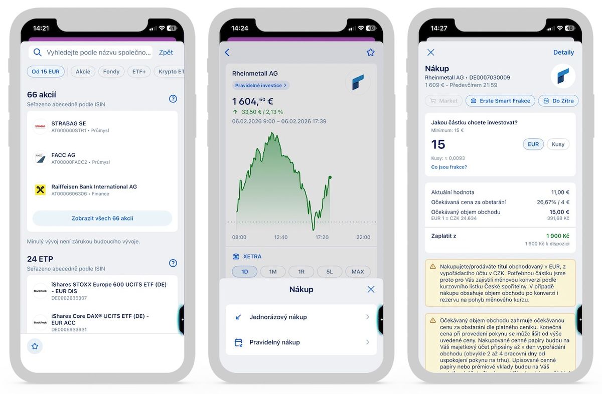 Nabídka frakčních akcií a ETF v mobilní aplikaci George (8. 2. 2026). První obrazovka: nabídka CP pro frakční investování. Druhá obrazovka: výběr konkrétní akcie. Třetí obrazovka: jednorázový příkaz k nákupu vybrané akcie.
