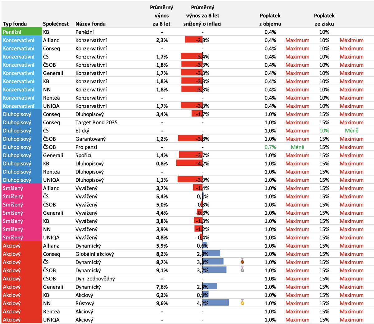 Z tabulky je vidět, že pouze akciovým fondům se v 8letém horizontu daří porážet inflaci. Pokud sis před 8 lety vybral/a libovolný akciový fond, tak se ti podařilo zachovat reálnou hodnotu peněz. Naopak - pokud sis vybral/a libovolný jiný fond, tak reálná hodnota tvých peněz v naprosté většině klesla.