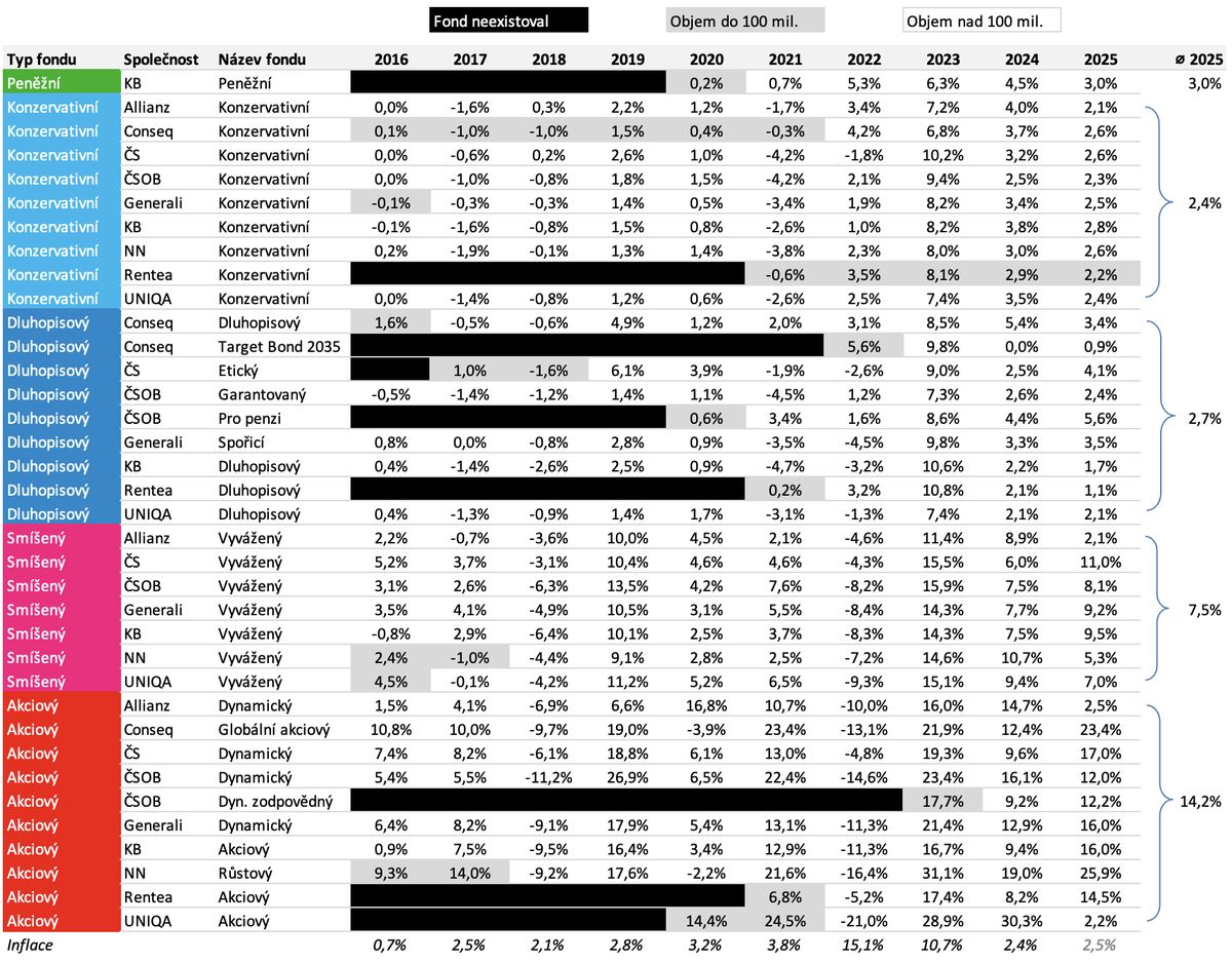 Tabulka 1: Zhodnocení penzijních fondů v letech 2016-2025. Výpočet Eligot, zdroj dat: údaje na webech jednotlivých společností dne 5.1.2026