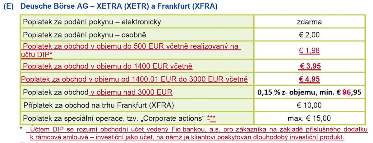 Dosavadní poplatek Fio za nákup akcií a ETF na německém trhu (Xetra) činil 0,15 % z objemu, minimálně 9,95 EUR. To znamenalo, že při investici do cca 160 tisíc Kč jsi zaplatil/a přibližně 240 Kč fixně. A to nebylo málo.