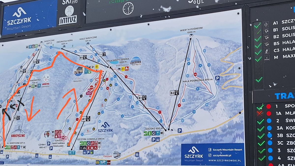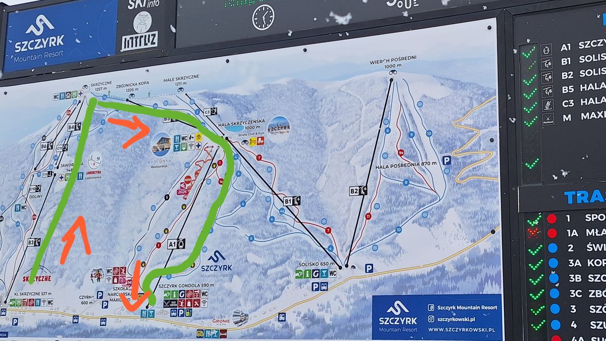 Po vyzvednutí skipassů jsme zaparkovali na parkovišti pod lanovkou Skrzyczne, vyrazili lanovkou směr Jaworzyna a odtud až na vrchol hory Skrzyczne (1257 m n. m.). Jelikož jsme s dětmi (7 a 10 let) chtěli jezdit po modrých sjezdovkách, zjistili jsme jednu nemilou věc.
