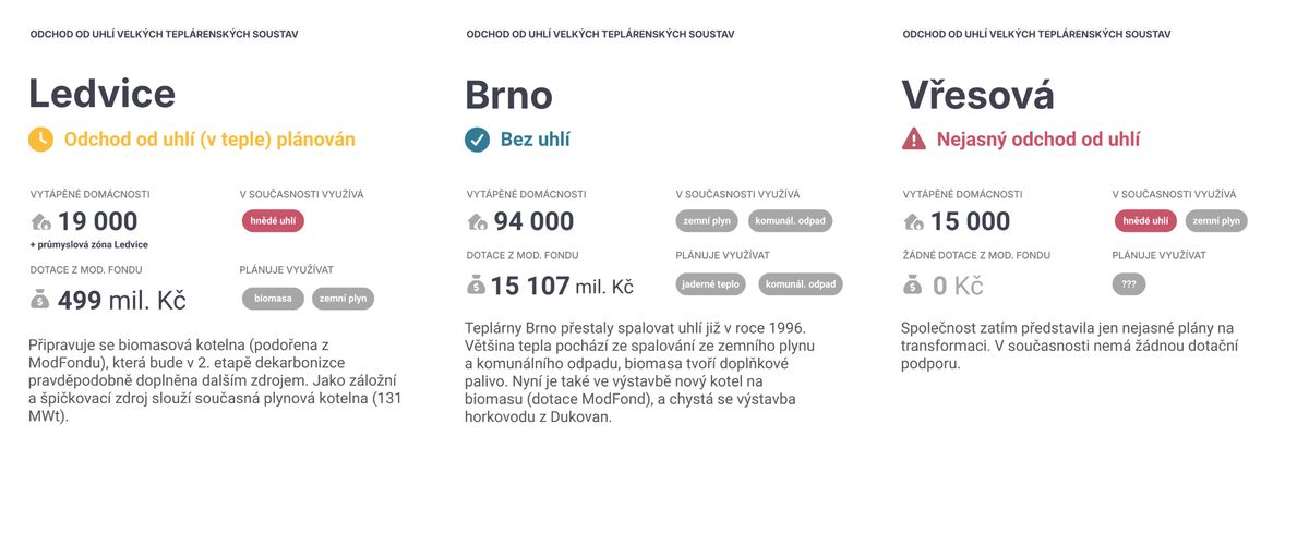Přehled ukazuje základní informace o transformaci soustav zásobujících domácnosti teplem v Česku. Odchod od uhlí byl již dokončen u třinácti velkých soustav, které zásobují přibližně 270 000 domácností. Největší část (740 000 domácností v 18 soustavách) právě přechází ze spalování uhlí na jiné zdroje. Čtyři soustavy (teplárny Kladno, Zlín, Vřesová a Tisová), které zásobují 65 000 domácností, zatím nemají odchod od uhlí dostatečně jasně naplánován. Nejčastějším palivem, které nahrazuje uhlí, je zemní plyn, který doplňuje biomasa a odpad.