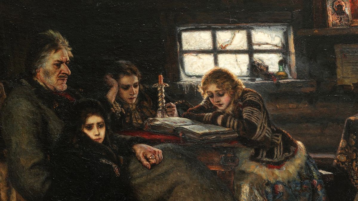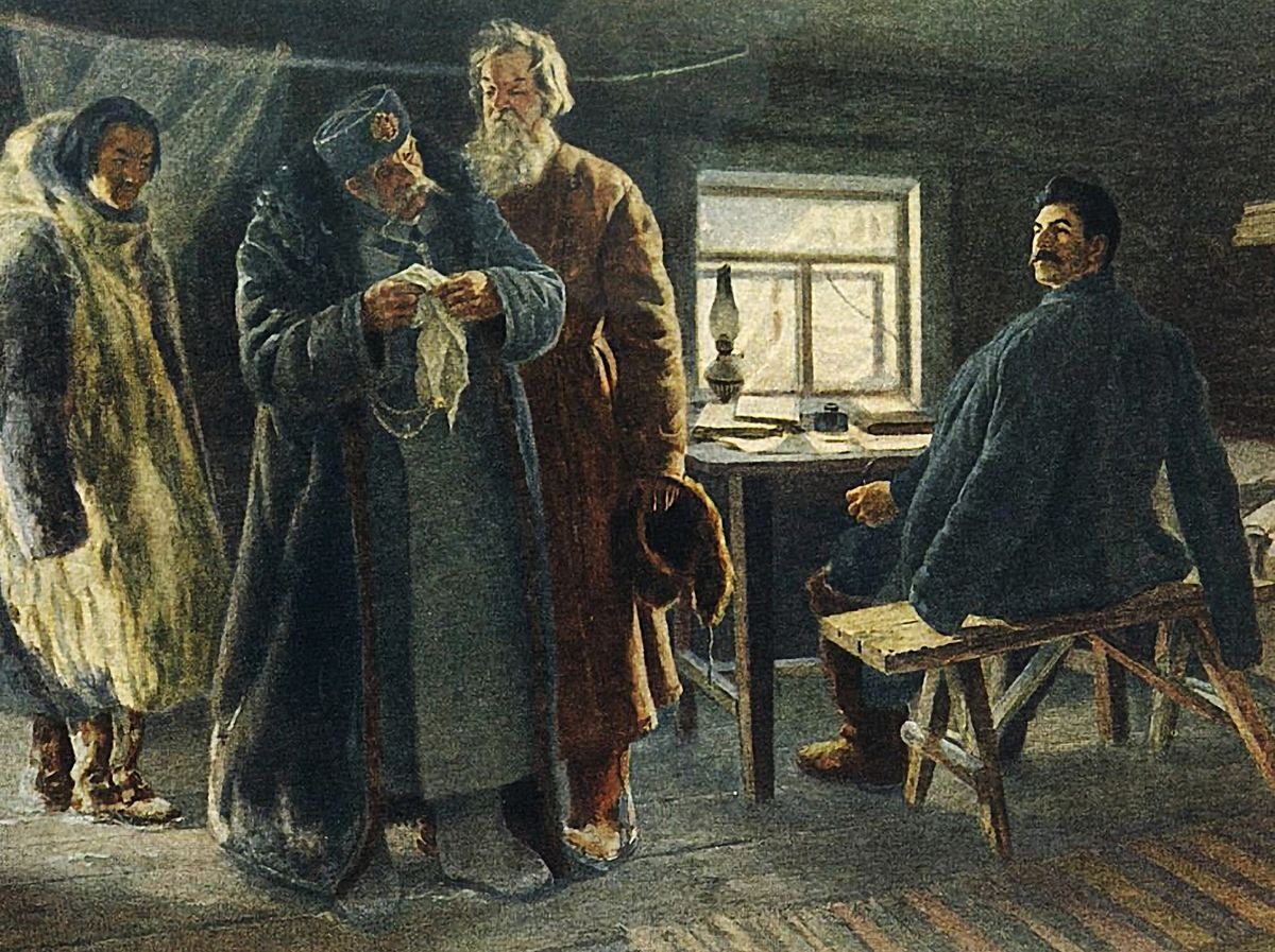 P. P. Sokolov-Skalja. „Stalin v turuchanském exilu v roce 1916“ (1949). Obraz zachycuje Stalinovo fešácké vyhnanství, které trávil rybolovem a zneužíváním hospodářovy dcery.