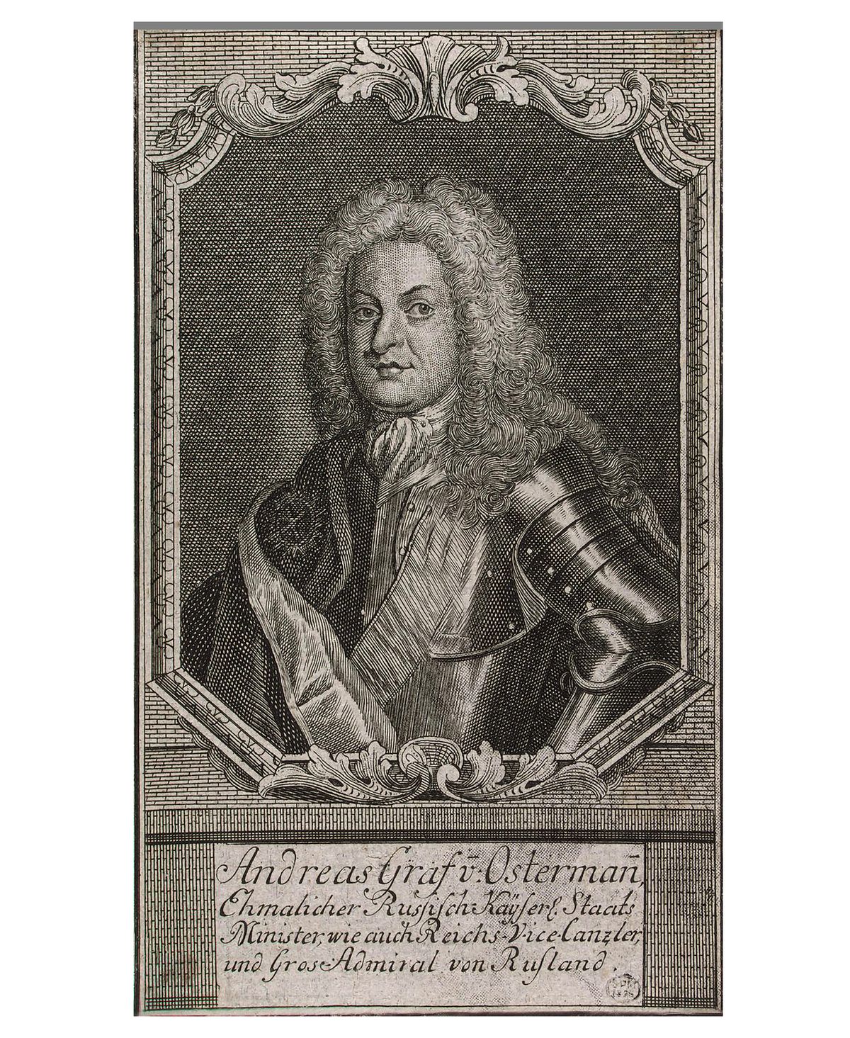 Hrabě Heinrich Johann Friedrich Ostermann (rusky Andrej Ivanovič Ostermann; 1686-1747), rytíř Řádu sv. Alexandra Něvského, byl významný ruský diplomat, politik, velkoadmirál a generál, který upadl v nemilost dvora po intronizaci carevny Jelizavety, která mu zazlívala, že usiloval o její vyloučení z nástupnictví.