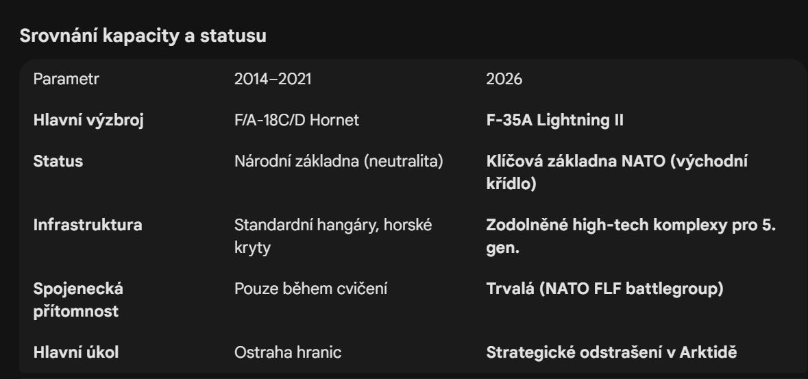 - Se vstupem Finska do NATO došlo i v této zemi k razantnímu posilování a modernizaci obranných struktur. Letecká základna Rovaniemi (oficiálně sídlo Lapland Air Command) prošla v letech 2014–2026 nejvýznamnější transformací ve své historii. Z regionální základny bránící finský sever se stala klíčovou předsunutou baštou NATO v Arktidě, která od roku 2026 hostí nejmodernější letouny 5. generace (NATO FLF / Forward Land Forces).