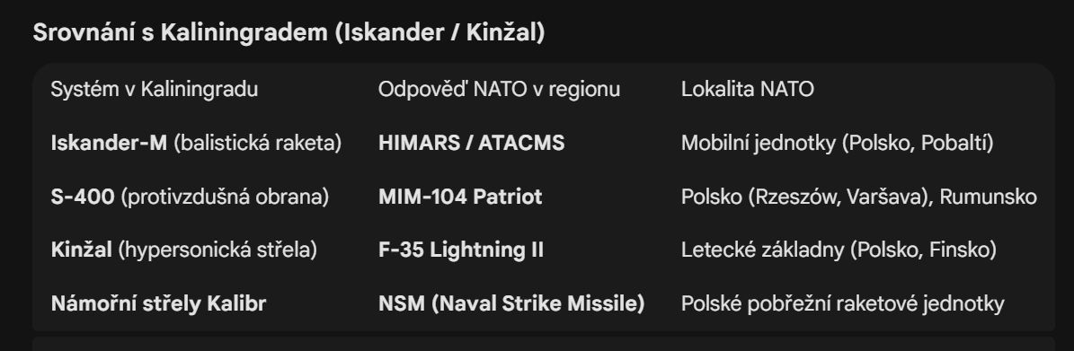 NATO v blízkosti Ruska nebuduje kopie ruských raketových brigád. Místo toho sází na vysokou mobilitu (HIMARS), sofistikovanou protiraketovou obranu (např. Aegis Ashore v Redzikowu) a především na leteckou nadvládu z modernizovaných základen ve Finsku, Norsku, Polsku, Pobaltí a Rumunsku. Pokud např. Rusko sází na statickou sílu raket v Kaliningradu, NATO sází na schopnost tyto rakety sestřelit a následně odpovědět pomocí letectva z několika rozptýlených základen.