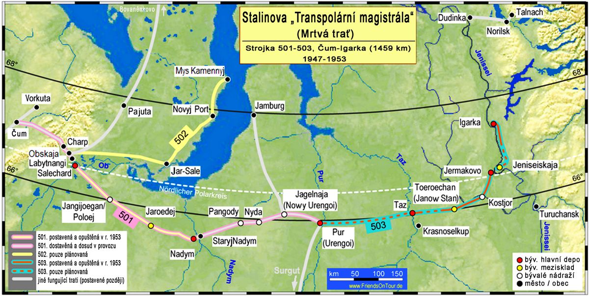 Mapa Stalinovy Transpolární železnice neboli „Mrtvé trati“
