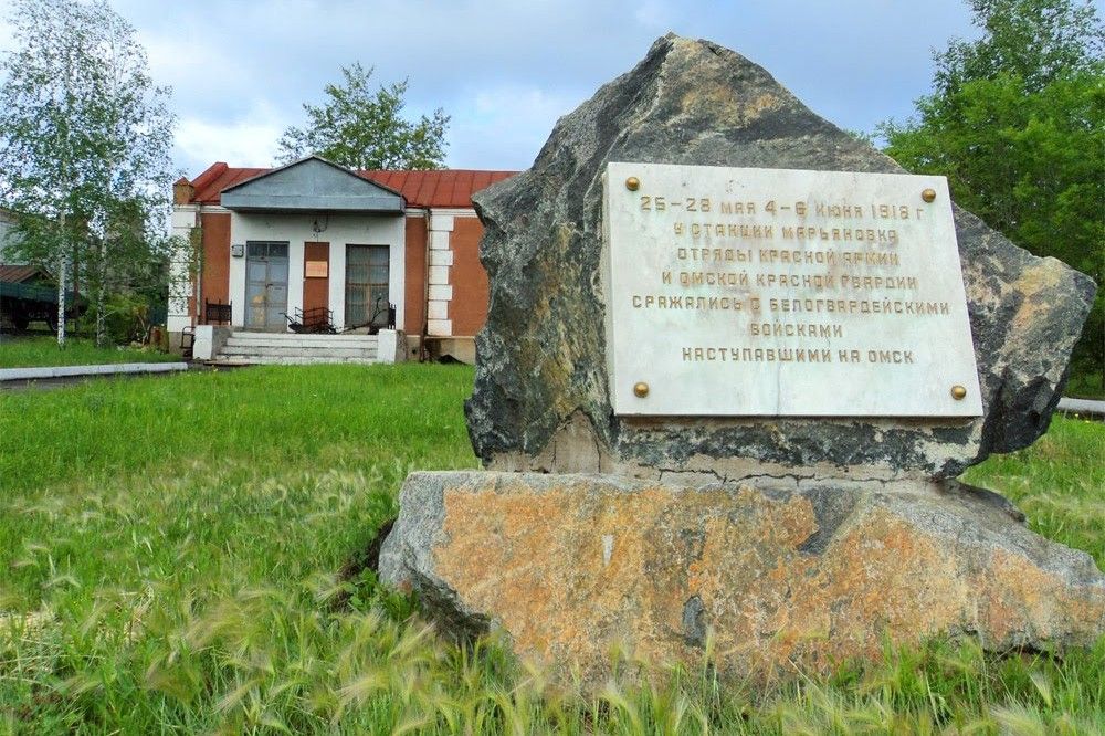 Poblíž nádražní budovy se nachází kamenný kvádr a na něm pamětní deska s nápisem „25.-28. května a 4.-6. června 1918 se u stanice Marjanovka střetly oddíly Rudé armády a omských Rudých gard s bělogvardějskými vojsky útočícími na Omsk“.