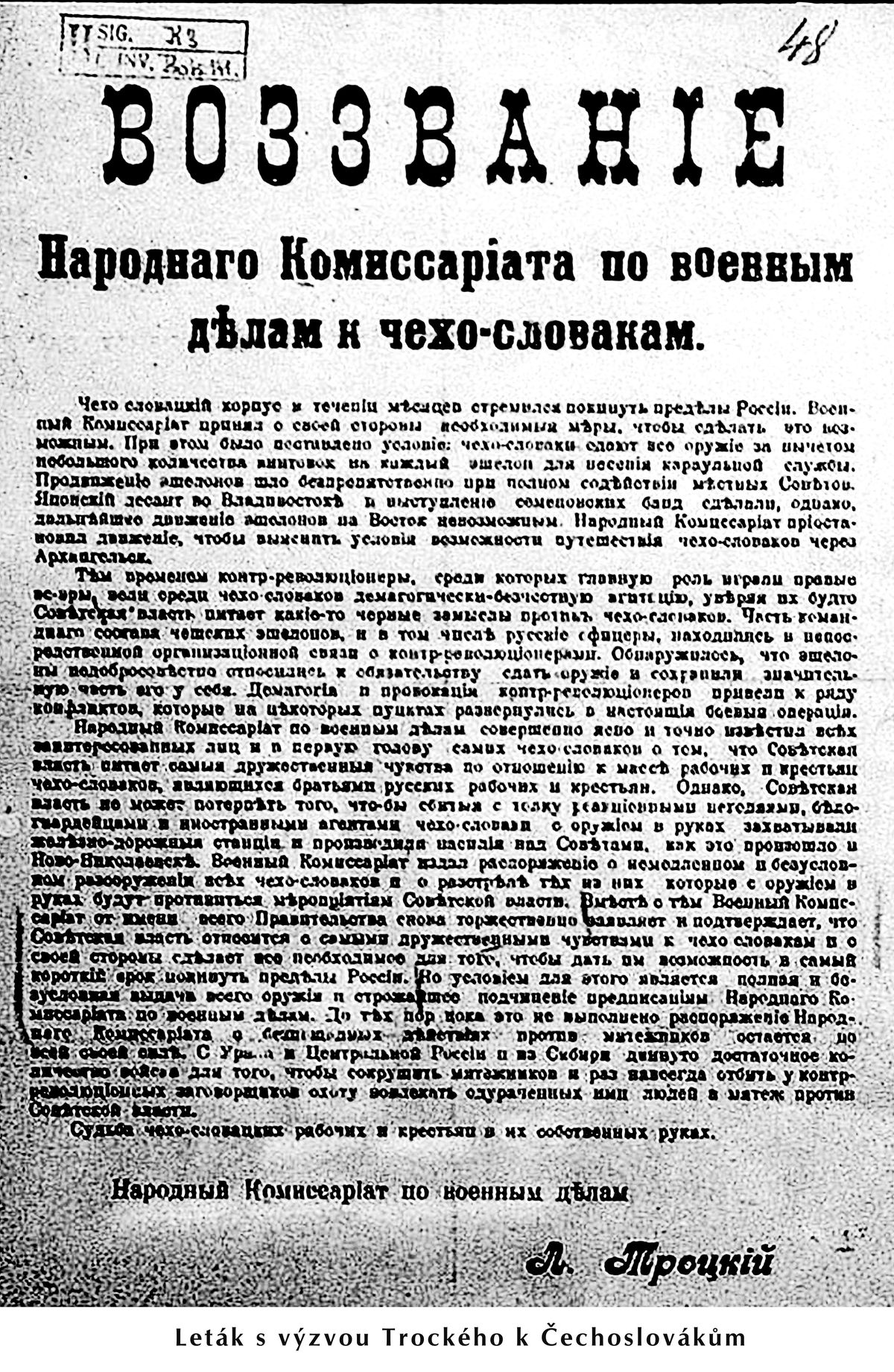 Všichni železničáři zaručí, že ani jediný ozbrojený vagon Čechoslováků se nepohne na východ. Kdo ustoupí a nepostaví se Čechoslovákům postupujícím na východ, bude přísně potrestán.