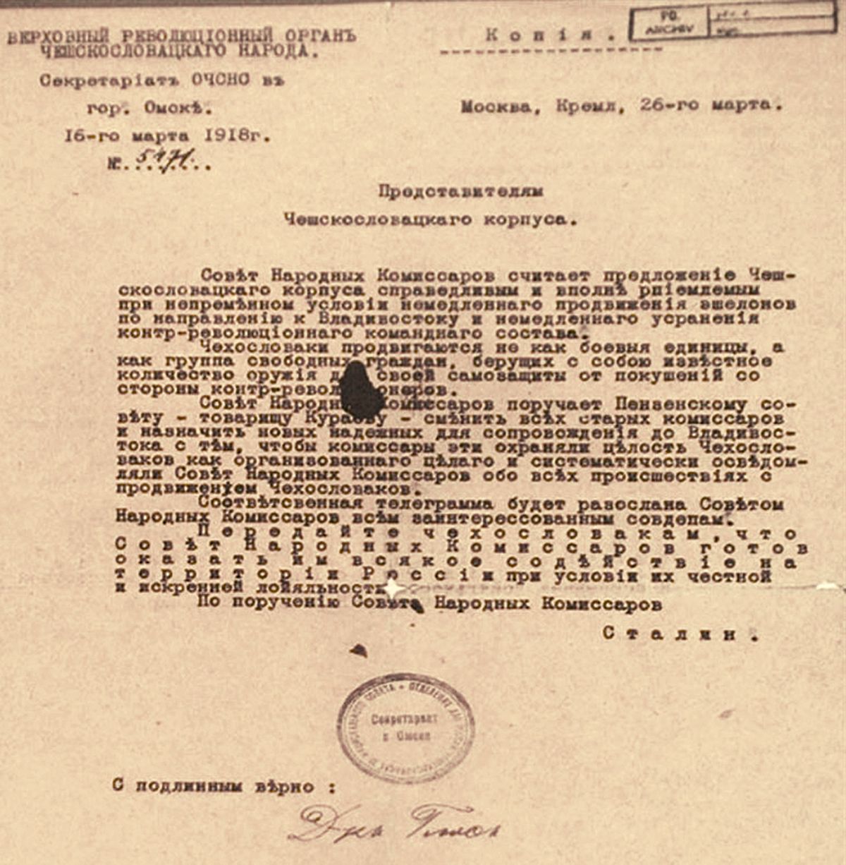 Oficiální souhlas Stalina s průjezdem Legií do Vladivostoku (26.3. 1918)