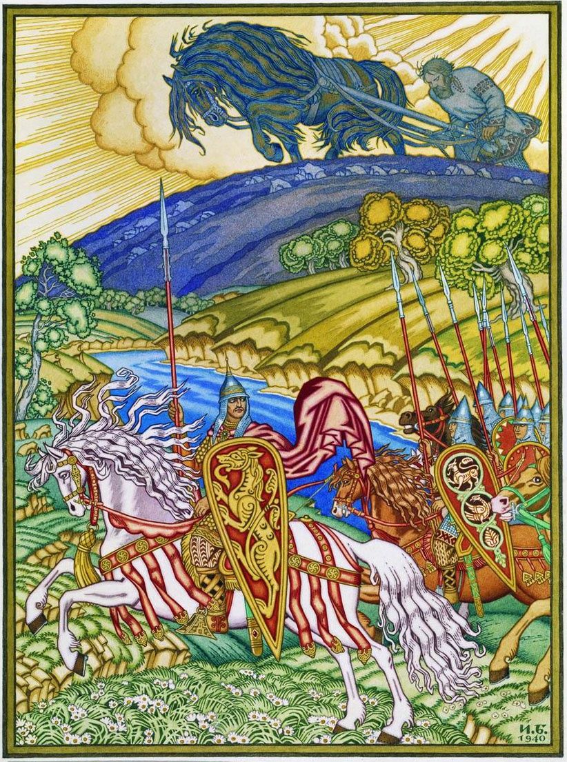 Ivan Bilibin: Bohatýr Volga Svjatoslavič a Mikula Seljaninovič (1940)