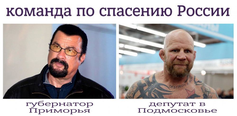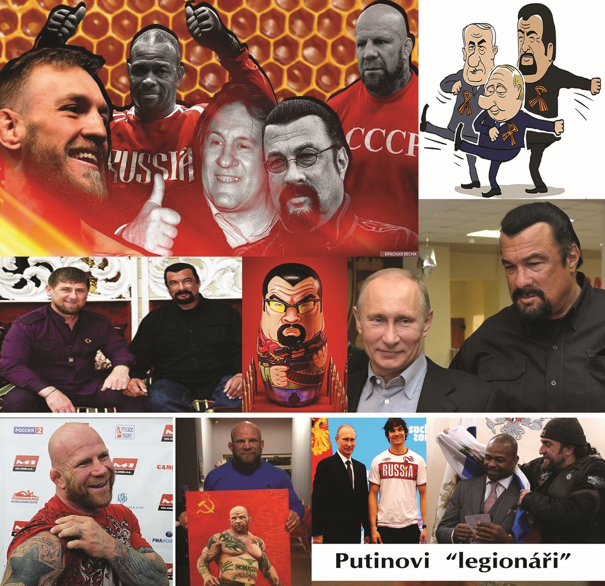 A tak vidíme Dennise Rodmana či Gérarda Depardieua[5] po boku Putina či korejského, čečenského anebo běloruského diktátora, Jeff Monson a Steven Seagal se objímají na Donbase s ruskými žoldáky a vůdci východoukrajinských separatistů, opolčenců.