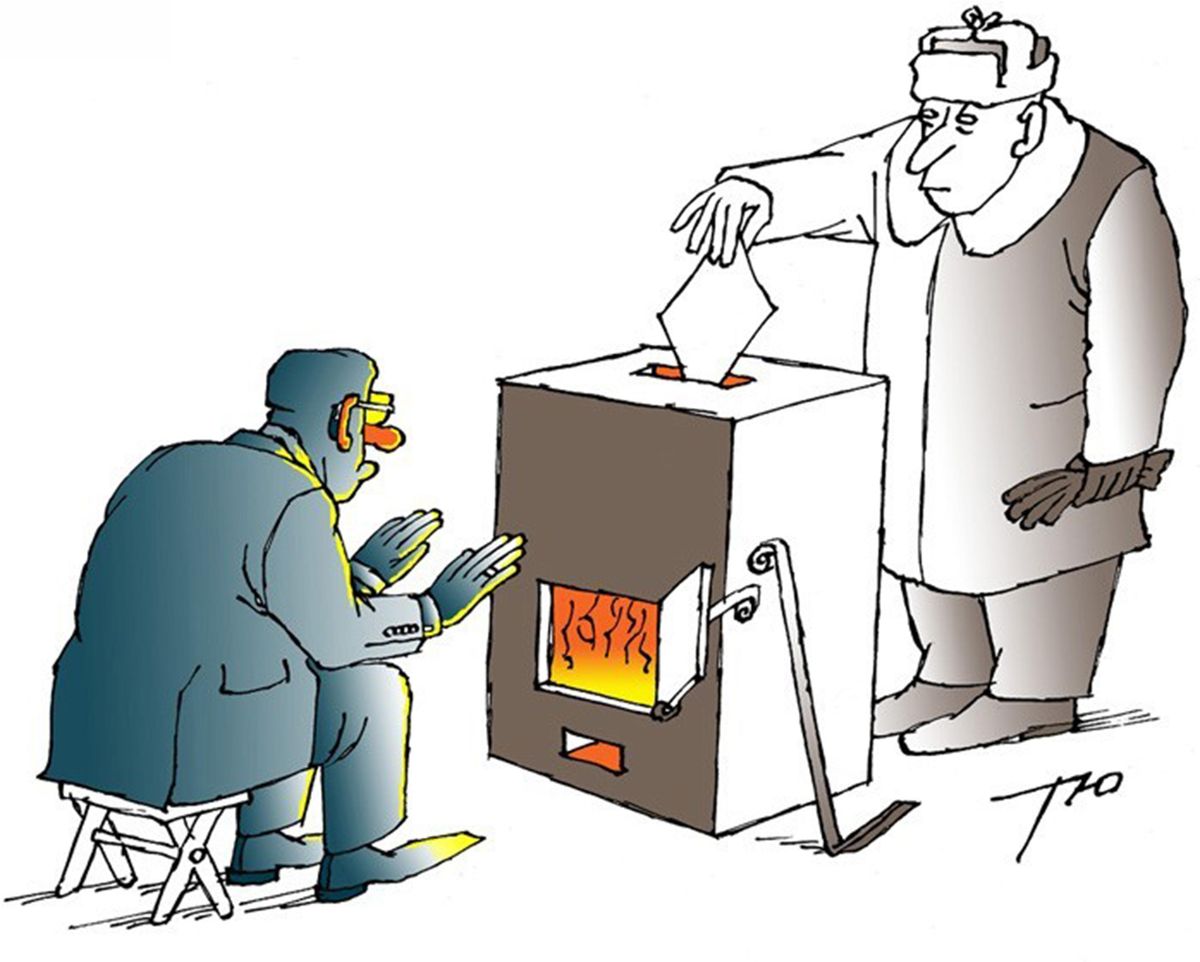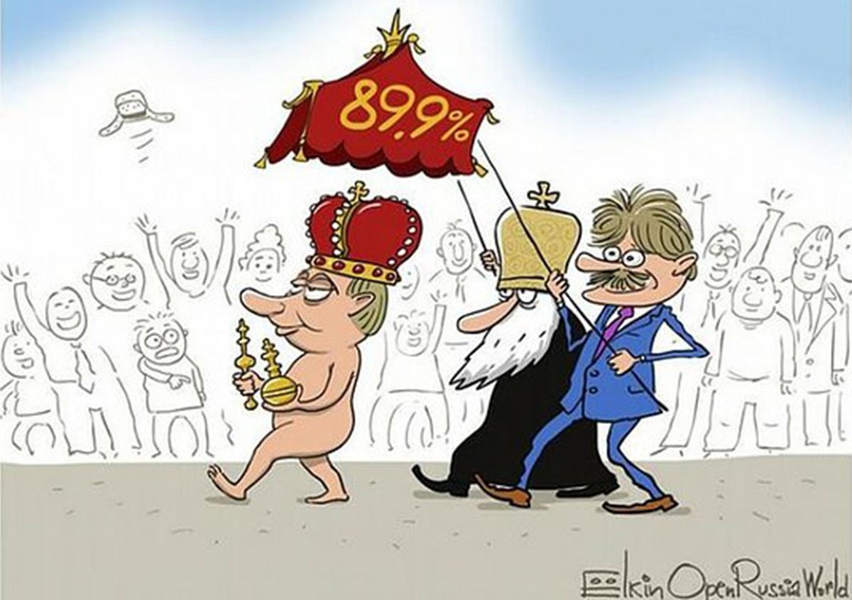Karikatura na téma ruských „voleb“ s uvedeným refrénem ze sovětské hymny