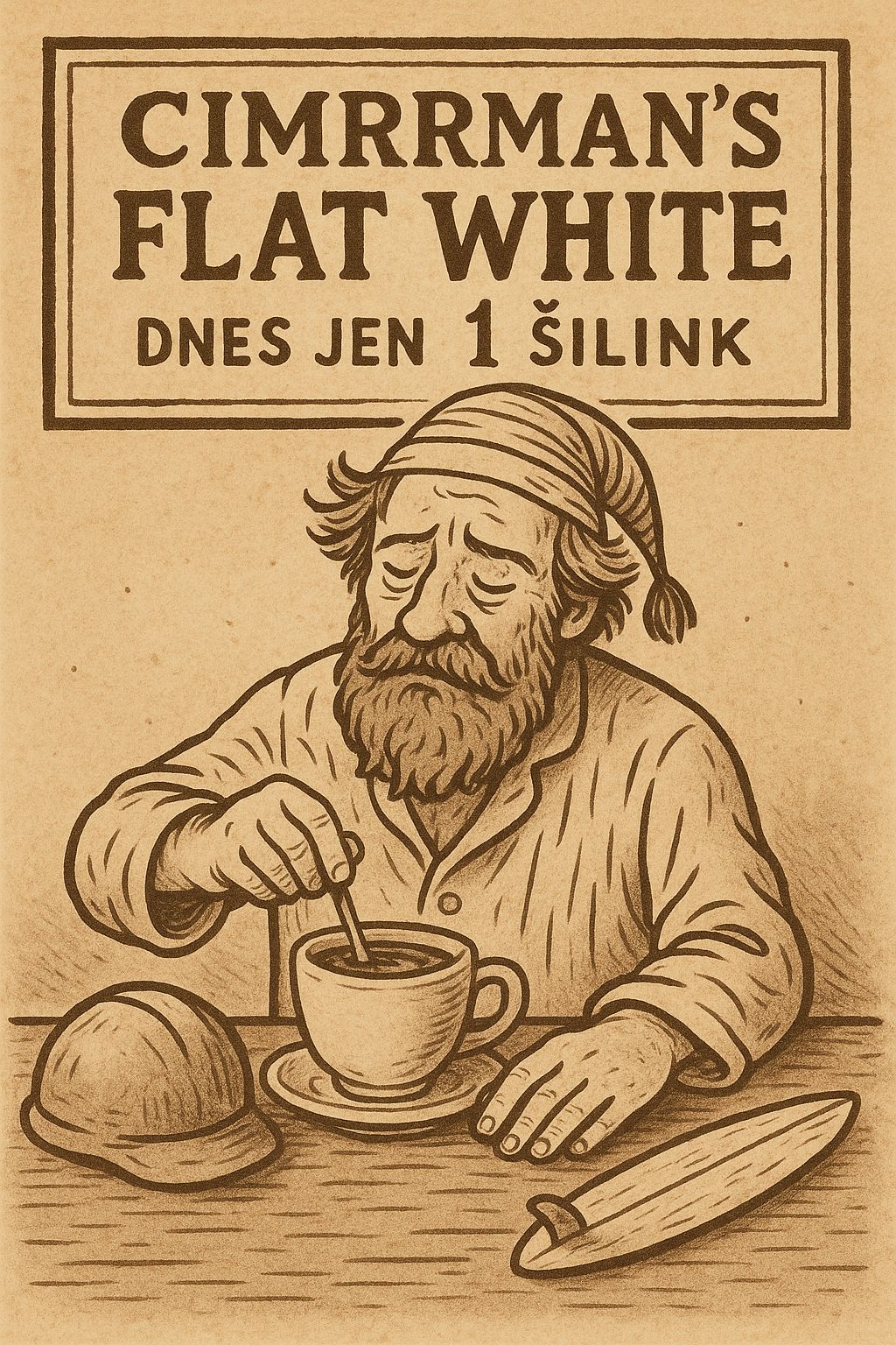 Cimrman se nechtěně zapsal i do kavárenské historie v Perthu. Nejdřív to bylo, že místním vysvětlil, jak se připravuje je oblíbená vídeňská káva. S další kávou to bylo trochu náhodnějši. Jak se blížil příjezd lodi s jeho věcmi, tak ji vybíhal netrpělivě vyhlížet do přístavu i v noci v noční košili a s loučí. Nevyspalý a rozespalý Cimrman si po ránu nechtěl připravovat náročnou vídeňskou kávu, ale potřeboval nějakého cloumáka, který by ho dostatečně probral. Proto si místo jedné dávky zrnkové kávy, dal dvě dávky a drahou šlehačku nahradil lacinějším mlékem. Jeho známím se tak nová káva zdála poněkud bílá a vizuálně plochá právě kvůli absenci šlehačky. A tak vznikl flat white tak oblíbený jak u pražské kavárny a pak i v celé Australii.