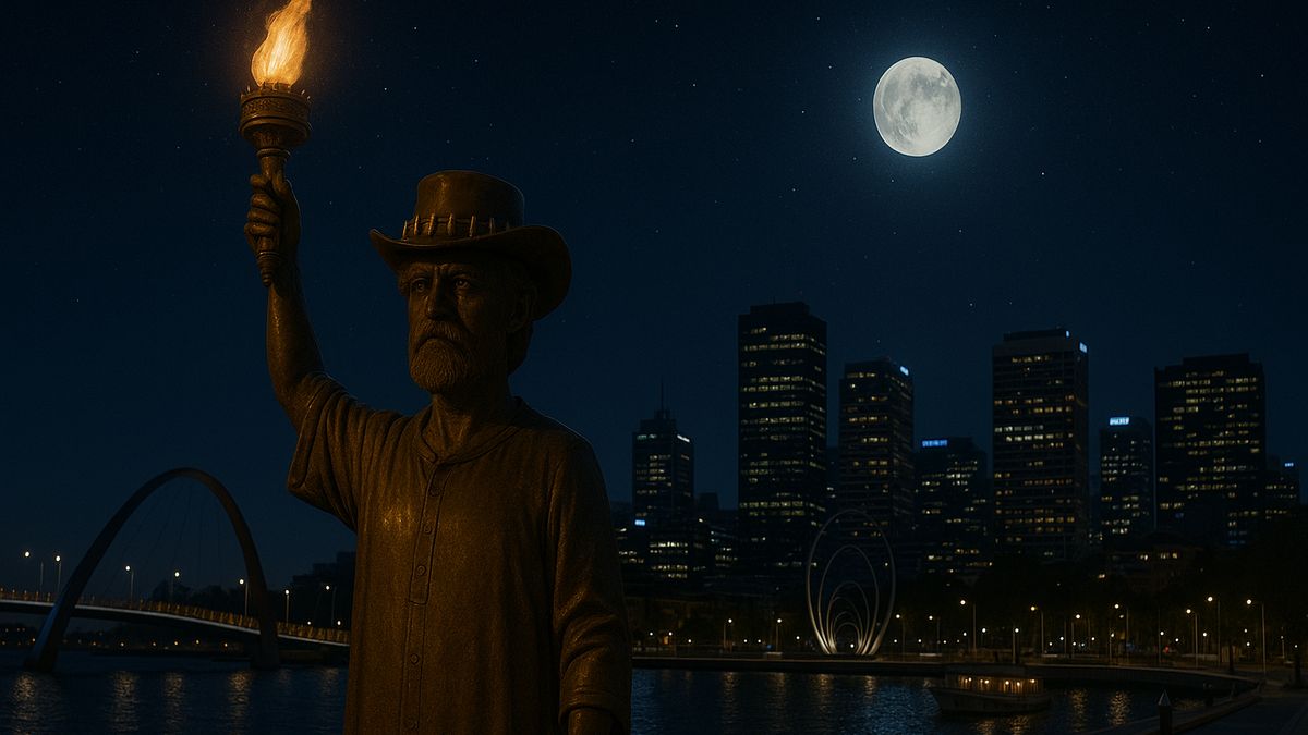 Po nějakém časovém odstupu, kdy Cimrman z Perthu odplul a windsurfing se stal populárním, chtěli místní postavit Cimrmanovi sochu, která by jim ho připomínala. S humorem jim vlastní vznikl model této sochy, kdy Cimrman v noční košili, kloboukem s krokodýlími zuby a loučí, jak vyhlíží svojí loď. Socha až nápadně připomínala připravovánou Sochu Svobody v New Yorku. Model sochy byl i umístěn do přístavu pro lepší představu, jak tam bude vypadat. Bohužel za dva dny přišla velká bouře, která sochu zničila a pověrčivý sochař raději sochu znovu nepostavil. Inu jaká škoda.