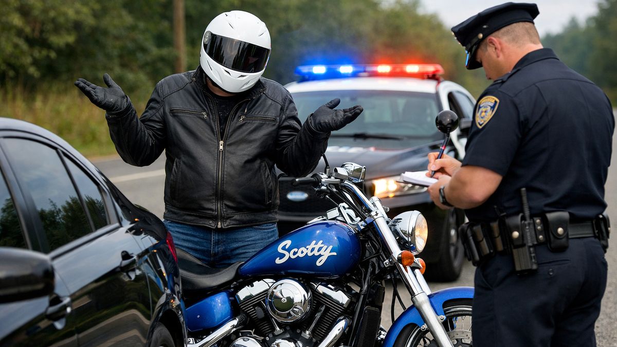 Když se blížím k semaforům všimne si mě řidič nejmenovaného auta. Abych se nedostal před něj vyrazí téměř na červenou tak prudce, že zapomněl že mají chodci přednost. Hned musí na brzdy až na přechodu člověk strachy upadne. Za námi se ozve známý zvuk a rozsvítí se maják. Policisté vystoupí a jdou k nám. Řidič hned spustí „Za to může on, to je jeho chyba!“ Neváhám a přiznávám se „Ano pane policisto, je to tak.“ Policista se na mě podívá a já pokračuji „prostrčil jsem mu ruku oknem a tlačil na plynový pedál i když stál na brzdě. Uznávám moji chybu.“ Policista se zamyslí a říká „No tak to jsem tu ještě neměl, takhle pitomé přiznání.“ Jeho kolega neříká nic, snaží se schovat smích. Výsledek je takový, že řidič dostane varování, to že se blíží motorka, neznamená že může přejet chodce. Řidič argumentuje dál už jen běžnými nesmysly, ale to já už jsem propuštěn a pokračuji dál.