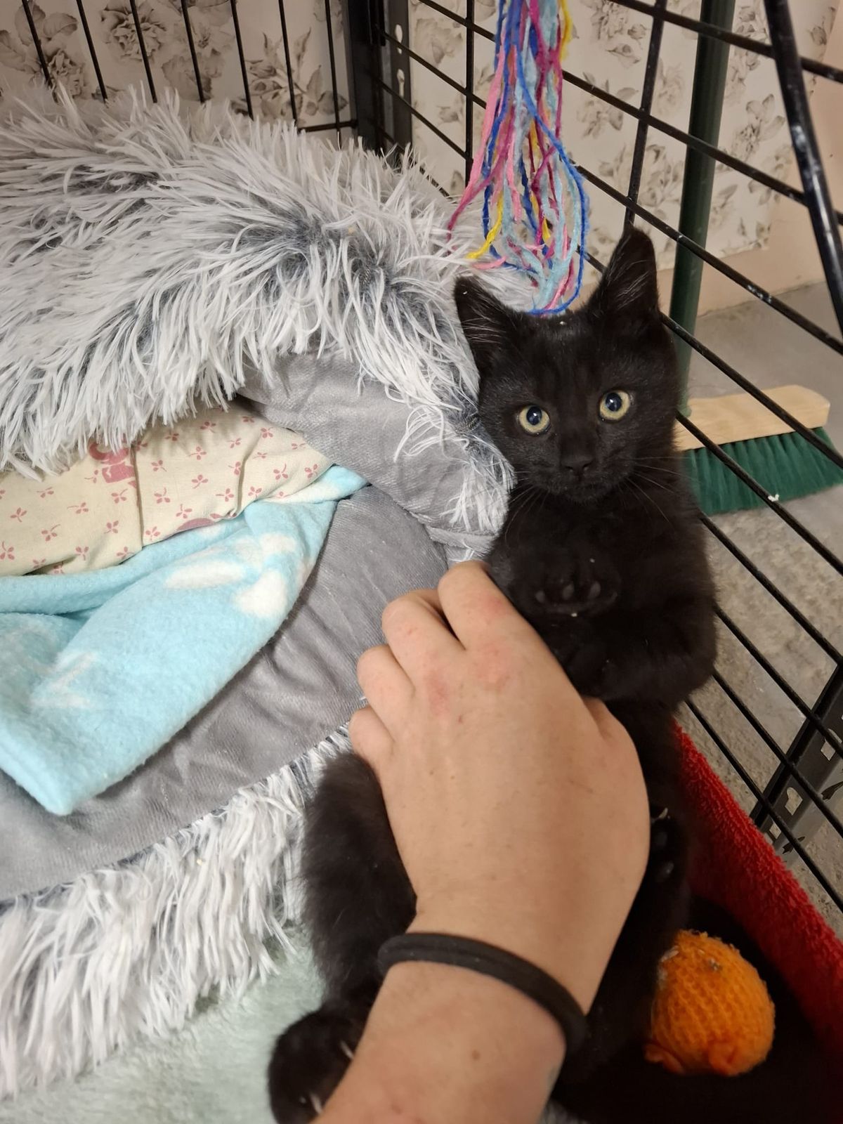 S dobrovolnicí Ivou jdeme ke koťátkům. Tomík a Rózinka jsou černí a hraví. Než Tomíka vrátím do vyčištěného kotce, hrajeme si.