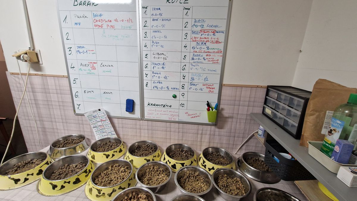 V přípravně je kolem dvaceti misek se snídaní pro pejsky. Zalévám vodou a míchám, aby si nespálili čumáčky. Pak následuje krmení „divoké zvěře“.