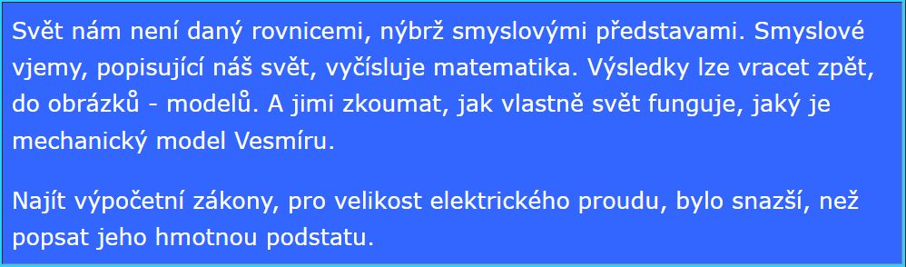 Kdežto fyzika staví víc dopředu počítání a upozaďuje mechanické modely. Dosáhla sice kolosálních úspěchů, ovšem věta „fyzika jako geometrie“ byla důležitými vědci vyslovena už dávno. Žijeme ve hmotě; její matematický popis je důležitý, ale…