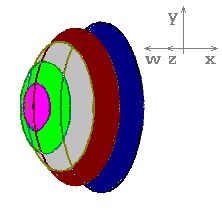 Obrysem 4D koule je také jen kružnice. 4D koule by vznikla naskládáním koulí od nejmenší k největší a zase zpět. Byly by snad nakládané jedna za druhou? Ne, navzájem by se sousedky pronikaly, posunuté jen o nepatrný kousek. V mém pokusu, v obrázku jsou koule (postupně fialová, zelená, šedá, hnědá a modrá) deformované v elipsoidy. Obdobně jako na obrázku koule, umístěném výše, kde ji tvořily elipsy – vzniklé šikmým pohledem na kružnice.