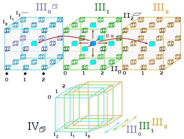 Sestava krychlí vytvoří 4D krychli. Každá použitá krychle má ve 4D prostoru svůj 3D prostor.