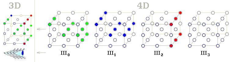 Ve 4D prostoru by měl tvor 3D vidění, sítnicí je krychle vlevo. Vnímal by celý objem III0 toho prvního ze všech objemů III0– III3, jež mu tvoří sledovaný 4D prostor. První z 3D objemů není celý zaplněný hmotou (zelené body), takže dál by se Čtverákův 3D vjem v 3D sítnici doplňoval zářením z hmoty vzdálenějších objemů III1 a III2. Ze III1 by do sítnice pronikl jediný modrý bod, ostatní by zadržel objem III0 pozorovaného 4D objektu (III0 – III2).