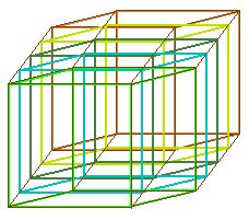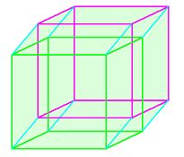 Hypotetický 4D prostor je složený ze sousedních objemů. Hodnotím je jako posunuté vždy jen o malý kousek. To se pak svými objemy prostupují – dle našeho hodnocení? Ne, ony objemy existují každý sám pro sebe, neprostupují se ← v odkazu se kreslí sled krychlí, a nakonec se zdůrazní obrysy. Až to je obvyklé zobrazení 4D krychle.