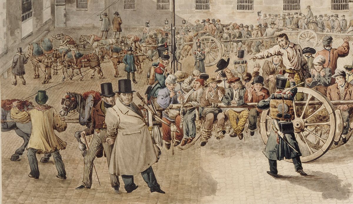 Věznice Bicêtre v Gentilly. Odvádění trestanců do trestanecké kolonie. Akvarel vytvořený Gabrielem Cloqueminou, kterého Vidocq zatkl v roce 1832.