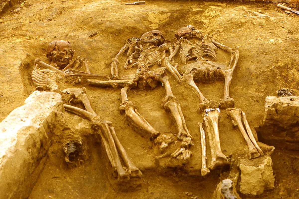 Analýza kostí ženy odhalila pravostrannou skoliózu a zkrácení levého předloktí i pravé stehenní kosti, což naznačovalo, že byla těžce postižená a kulhala. Žena nezemřela násilnou smrtí a v jejích ústech bylo vloženo ožehnuté koňské žebro. Oba mladíci byli zdraví a zemřeli násilně. Jeden pravděpodobně po bodné ráně do podbřišku, jak naznačuje zbytek oštěpu, druhý po tupém úderu do hlavy.