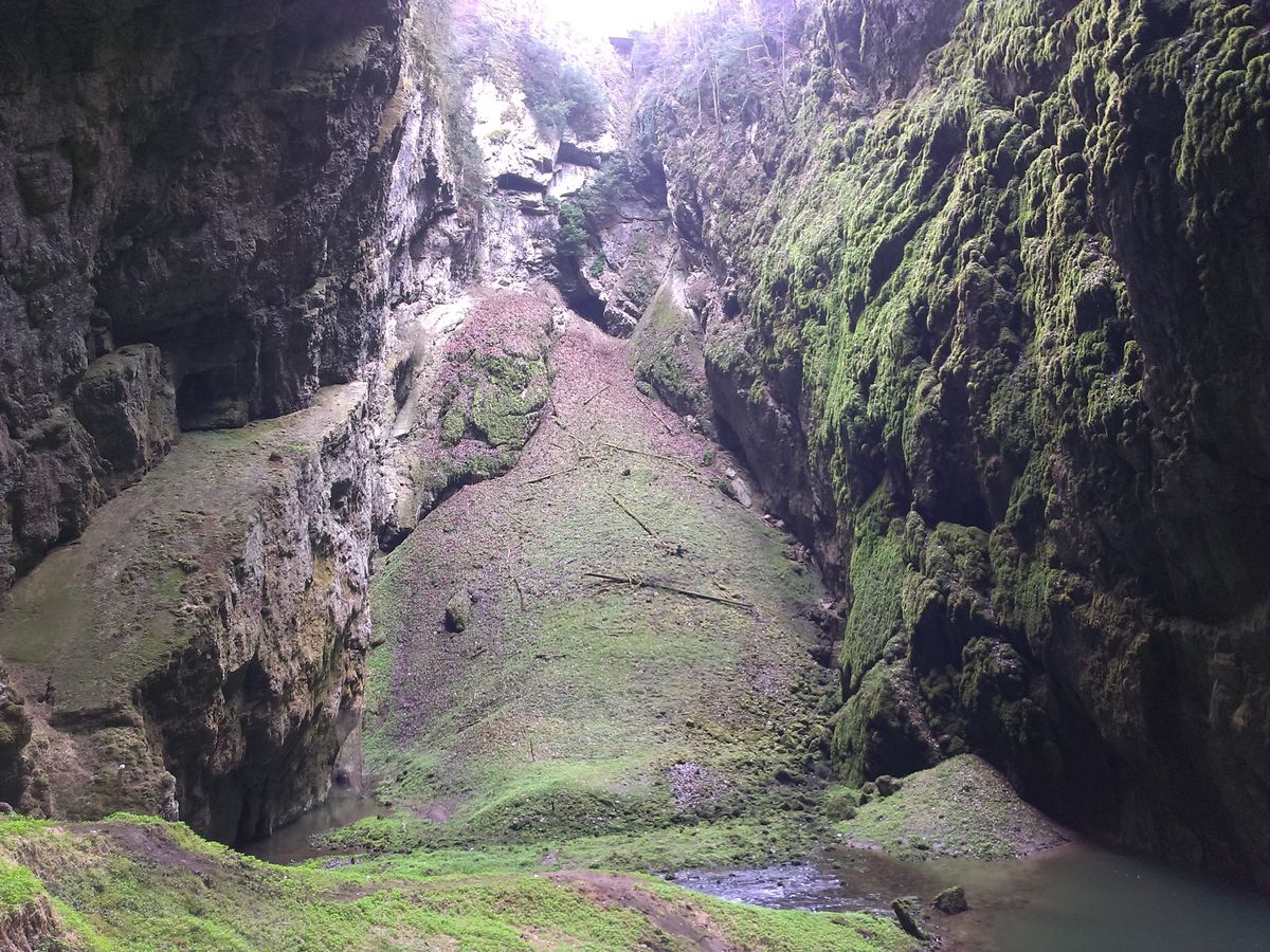 Cesta dolů nás zavedla po schodech do síně U anděla. Pak tunelovou chodbou, umělou štolou až na dno propasti Macochy, odkud je vidět 138,5 m vysoká skála, která končí vyhlídkou.